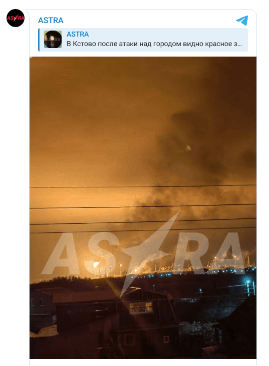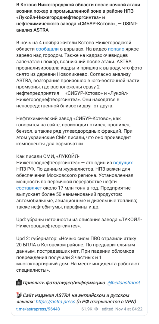 Об атаке дронов на промзону также написали паблики города Кстово под Нижним Новгородом. Там находятся несколько нефтеперерабатывающих заводов — они принадлежат «Лукойлу» и «Сибуру». На территории промзоны произошло возгорание, издание Astra опубликовало кадры очевидцев с пожаром. Подробностей о повреждениях нет. Власти региона не сообщали о последствиях.
