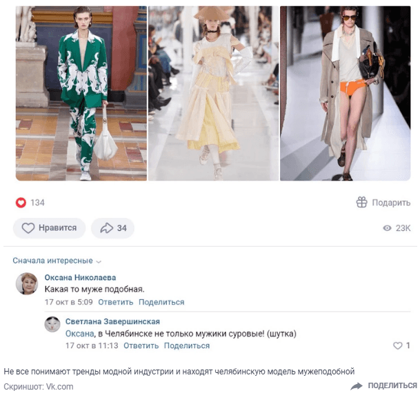 — Есть бренды со своим эталоном стиля. Уникальность модели в том, чтобы она могла трансформироваться под разные образы. Чтобы из нее можно было и красивую сделать, и мужественную, и какую-то странную. Если она всегда будет выглядеть одинаково, это быстро надоест. Один мужчина написал в комментариях, что она похожа на мужика, а ему ответили, про «суровый Челябинск». Но это всего лишь мнение обывателя. Есть модные тенденции и модные лица, потому что мы в моде работаем. У нее модное лицо, поэтому ее французское агентство пригласило.