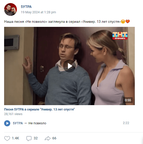 Песня омской группы «5УТРА» прозвучала в новом эпизоде сериала «Универ.13 лет спустя» (16+) на телеканале ТНТ. Об этом участники группы Никита и Анна Беляковы рассказали на своей официальной странице в социальной сети «ВКонтакте».