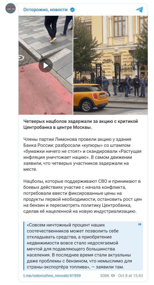 В центре Москвы задержали четверых членов партии «Другая Россия Э. В. Лимонова», которые протестовали против политики Центробанка, сообщают телеграм-каналы «Национальная правозащита» и «Осторожно, новости».